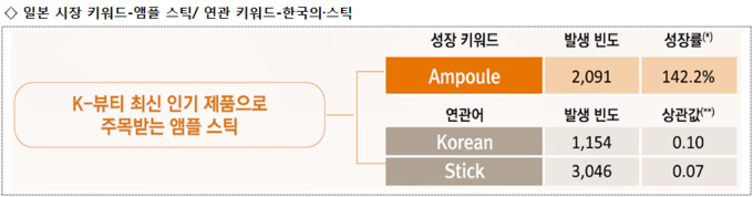 일본 시장의 경우 앰플(Ampoule)이 주요 키워드다. △ 한국의(Korean) △ 스틱(Stick)이 연관 키워드로 나타나며 한국 앰플 스틱 제품이 주목받고 있다.