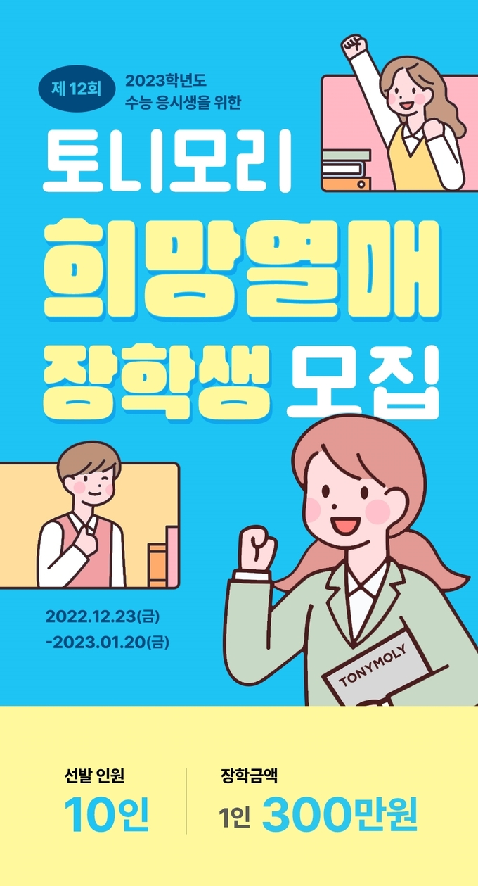 토니모리 관계자는 “학업에 대한 열정을 가지고 수능을 준비한 수험생에게 박수를 보낸다. 미래의 주역들에게 장학금을 지원하며 따뜻한 용기를 불어 넣겠다”고 말했다.