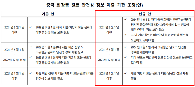 이와 함께 규제 과도기에 해당하는 내용으로는 △ 2024년 1월 1일 부터 특수화장품 허가 또는 일반화장품 비안 시 제품의 모든 처방 원료에 대한 원료 안전 정보 제출 △ 2021년 5월 1일 이전에 등록한 제품은 ‘화장품 안전 기술 규범’에 따른 규격의 원료가 사용된 경우에 한해 2023년 말까지 원료 안전 정보 보완 제출 △ 2021년 5월 1일부터 2023년 12월 31일 사이에 등록한 화장품은 연말까지 고위험군 원료(방부(보존)제·자외선차단제·착색제·염모제·미백 원료)의 안전성 정보를 제출하고 그 외 원료의 안전성 정보는 등록·허가인이 보유해야 한다는 등이다.