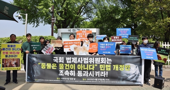 동물보호단체가 오늘 서울 여의도 국회 앞에서 기자회견을 열었다. 동물권행동 카라를 비롯한 동물보호단체 15곳은 민법 개정안의 조속한 통과를 촉구했다.