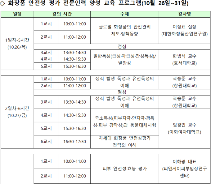 10월 31일(화)일까지 모두 4일에 걸쳐 23시간 교육이 이뤄진다. 화장품 안전성 평가 업무를 수행하거나 이에 관심이 있는 화장품 관련 종사자를 대상으로 소규모(선착순 30명)로 진행할 예정이다.