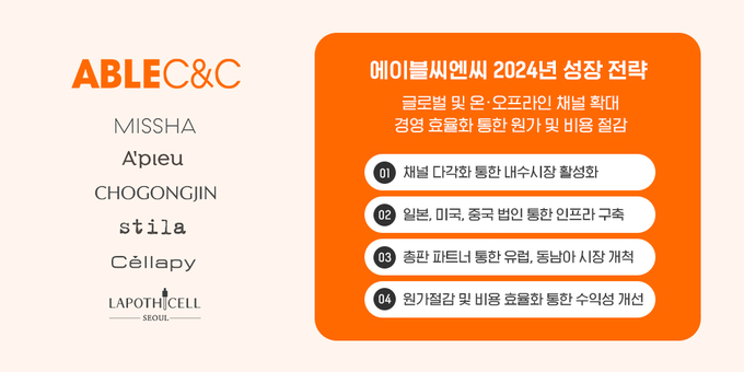 에이블씨엔씨는 올해도 국내외 매출 확대에 주력한다. 유통망을 확대하고 원가·비용 절감에 나선다. 유럽·동남아 신규 시장을 개척해 새 성장동력을 확충한다는 목표다.