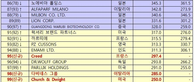 일약 31위에 진입한 Advent 인터내셔널(미국)을 비롯해 78위 Florasis(중국)·85위 RARE뷰티(미국)·95위 Creed(프랑스)·98위 다비네스그룹(이탈리아)·99위 Church&Dwight(미국) 등 6곳의 기업이 처음으로 톱 100에 이름을 내밀었다.