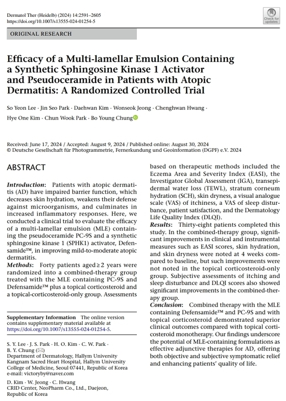 네오팜기술연구소 연구진(김대환‧정원석‧황정환)은 한림대 강남성심병원 피부과 정보영 교수팀과 연구를 진행했다. 연구에서 피부장벽 손상 부위에 스테로이드 제제와 제로이드 크림을 함께 바르면 건조하고 가려운 증상이 호전된다는 점을 확인했다.