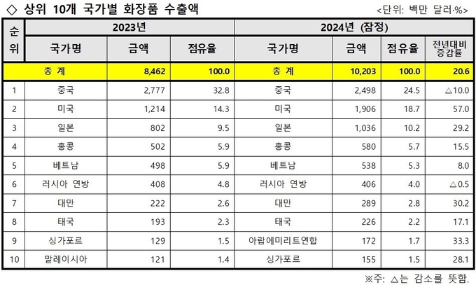 미국으로의 수출액은 2023년보다 6억9천만 달러(57.0%) 증가하면서 수출액 증가폭이 10위 내 상위국가 중 가장 컸다. 대 일본 수출액은 2억3천만 달러(29.2%) 증가했다. 대 일본 화장품 수출액이 10억 달러를 돌파한 것도 이번이 처음이다.