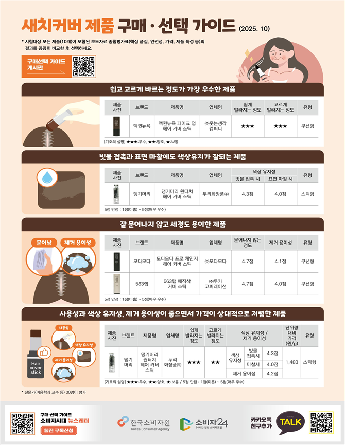 한국소비자원(원장 윤수현)이 새치커버 스틱‧쿠션 10종의 품질과 안전성을 평가했다.