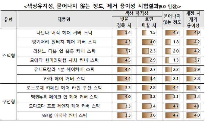 쿠션형이 묻어남이 적었다. ‘모다모다 프로 체인지 헤어 커버 스틱’과 ‘563랩 매직착 커버 스틱’이 4.7점을 받았다.
