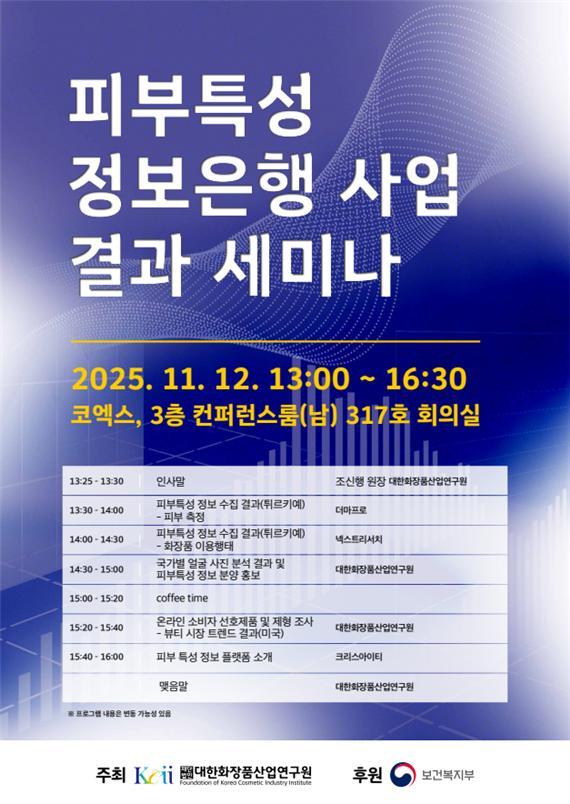 화산연 측은 “오는 11월 12일(수) 오후 1시부터 4시 30분까지 코엑스 3층 컨퍼런스룸(남) 317호에서 ‘피부특성 정보은행 사업 결과 세미나’를 개최한다”고 밝혔다.