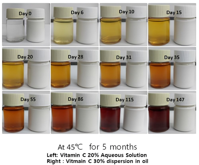 이 기술을 통해 첫째로 갈변 없는 고함량 비타민C의 안정화가 가능하다는 설명이다. 즉 △ 물이 전혀 포함되지 않아 비타민C의 산화 경로를 원천 차단하고 △ 오랜 기간 색상 변화 없이 안정성을 유지할 수 있으며 △ 기존 수상 기반 비타민C 제형이 가지고 있던 ‘초기부터 누렇게 변색’하는 문제를 해결할 수 있다는 것.