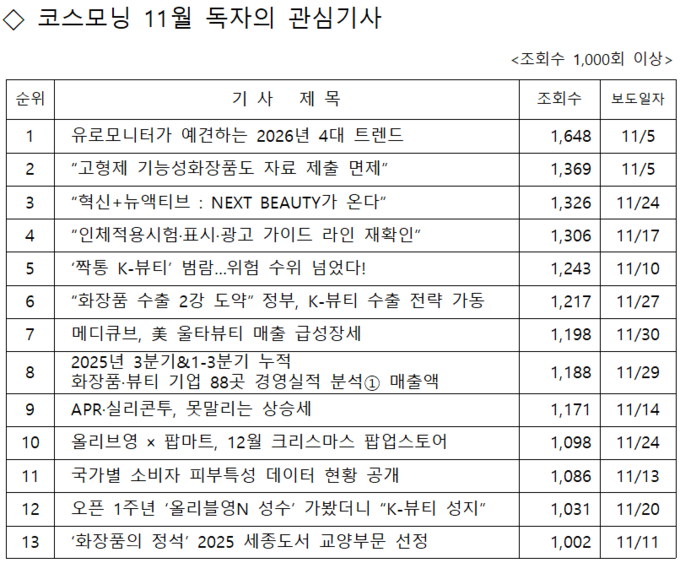 1위 기사는 ‘유로모니터가 예견하는 2026년 4대 트렌드’다. 글로벌 시장분석기관 유로모니터는 ‘2026년 글로벌 소비자 트렌드’로 △ 나만의 안식처(Comfort Zone) △ 있는 그대로(Fiercely Unfiltered) △ 웰니스는 과학(Rewired Wellness) △ 아시안 웨이브(Next Asian Wave) 등을 제시했다.