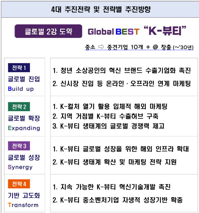 정부는 △ 뷰티 소상공인 지원 △ 해외 거점 확충 △ AI·친환경 기반 기술개발 등을 추진한다. K-뷰티의 글로벌 위상을 강화해 2030년까지 수출액 150억 달러, 수출 중소기업 수 10,000개를 달성한다는 목표를 세웠다.