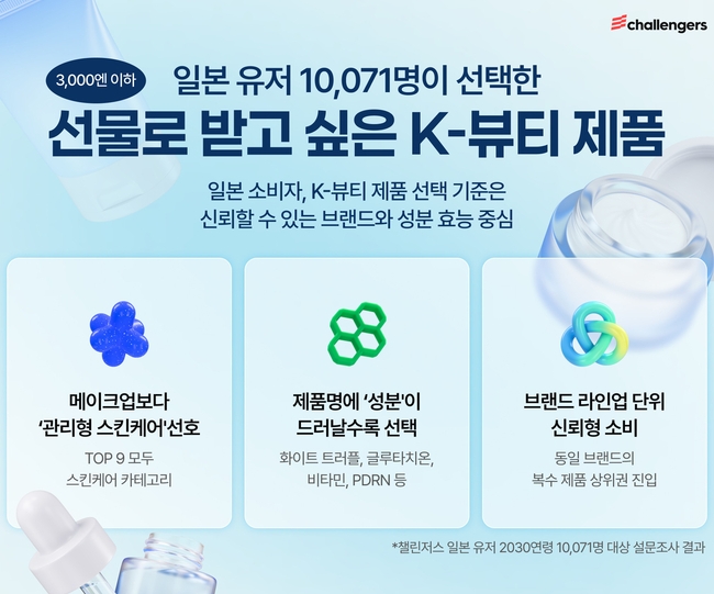 이는 화이트큐브(대표 최혁준)가 일본 소비자 10,071명을 대상으로 실시한 설문조사 결과다. ‘3,000엔 이하 선물로 받고 싶은 K-뷰티 제품’을 묻고 응답자들이 선택한 제품을 집계했다.