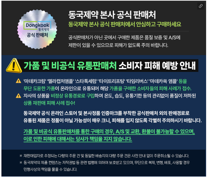 동국제약은 소비자에게 위조품과 정품의 차이를 안내하는 자료를 배포하고 있다. 오픈마켓을 포함한 온라인 유통 채널을 대상으로 상시 모니터링을 강화하고 나섰다. 위조 제품 발견 시 판매자를 대상으로 법적 대응을 할 방침이다.