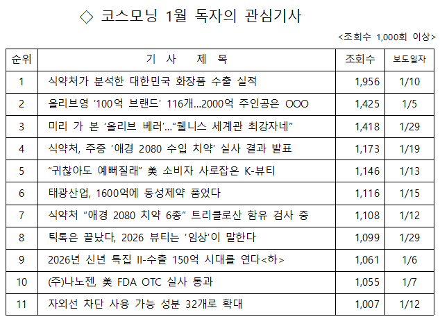 1위 기사는 ‘식약처가 분석한 대한민국 화장품 수출 실적’이 차지했다. 식품의약품안전처는 지난해 국내 화장품 수출액이 114억 달러를 기록한 것으로 잠정 집계했다. 이는 2024년보다 12.3% 증가한 수치로 역대 최대 실적이다.