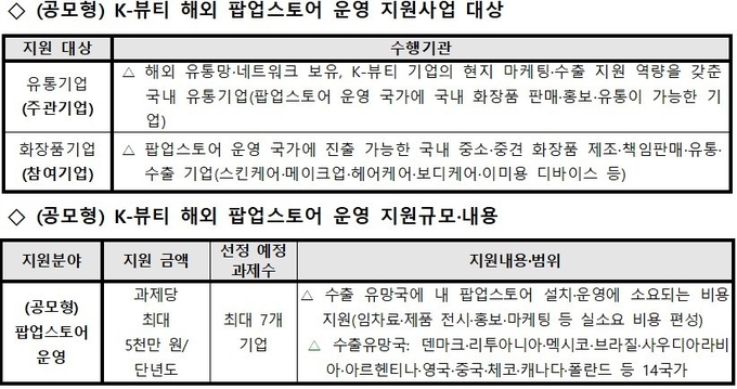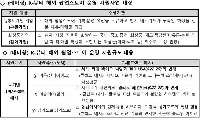 우리나라 화장품의 수출을 보다 효율성 높게 지원하고 각 수출 대상국별 상황과 트렌드에 부합하는 운영을 통해 글로벌 시장 지배력을 강화하기 위한 ‘K-뷰티 해외 팝업스토어 운영 지원사업’이 공모형과 테마형, 투 트랙으로 이뤄진다.