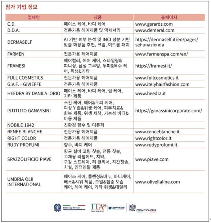 16개 참여 브랜드는 페이스‧메이크업‧보디‧선케어 제품과 향수, 뷰티 디바이스 등을 전시했다. 참가업체들은 이탈리아 뷰티 트렌드와 제품 특징을 다양하게 선보였다. AI 기반 피부 분석 솔루션 등 첨단 뷰티테크도 제시됐다.