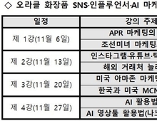 화장품 마케팅에서 그 필요성이 절실해 지고 있는 SNS·인플루언서·AI 관련 마케팅 CEO 과정이 오는 11월 6일 개강, 4회·매 강의 당 3시간 일정으로 매주 목요일 진행한다. 청담 오라클피부과(선정릉 역) 4층 회의실에서 진행하는 이번 과정은 화장품 기업 대표와 임원, 그리고 최신 화장품 마케팅 실전 전략에 관심이 있는 모든 관련자들을 대상으로 하고 있다. 각 일정의 △ 1교시는 오후 6시부터 8시까지(1시간 씩 2개 강의) △ 2교시는 오후 8시부터 9시까지 만찬·원우 간 교류 시간을 갖도록 구성했다. 등록금은 50만 원(부가세 포함)이며 신청은 최진우 과장(010-7452-1652)에게 하면 된다. 카카오톡 메시지로도 가능하다. 이번 마케팅 CEO 과정에 참여하면 오라클 CEO 과정을 수료한 원우 300여 명과의 친목을 도모하고 비즈니스 기회를 모색할 수 있는 기회도 함께 갖는다는 점에서 관심을 가질 만 하다는 업계의 평가다. 일정별 강의 내용은 다음과 같다.